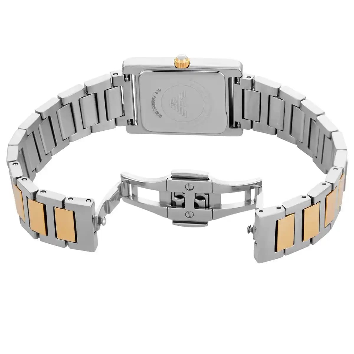 La montre Emporio Armani Genni AR11557 rectangulaire pour femme bicolore acier inoxydable et or rose avec cadran blanc et index chiffres romains.