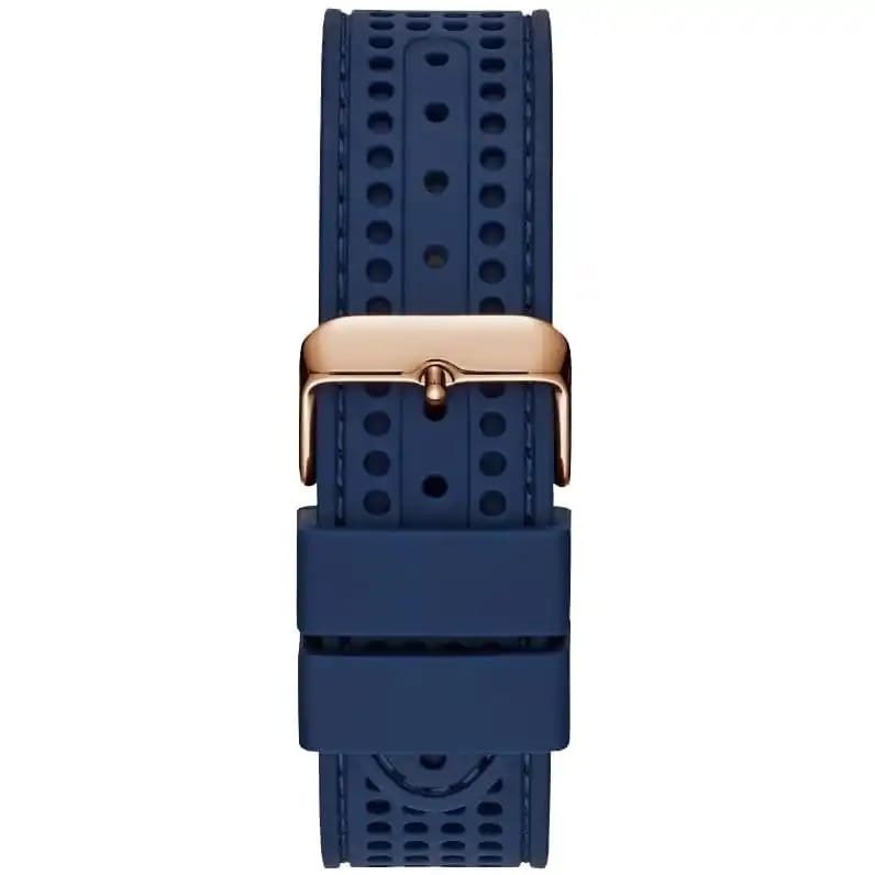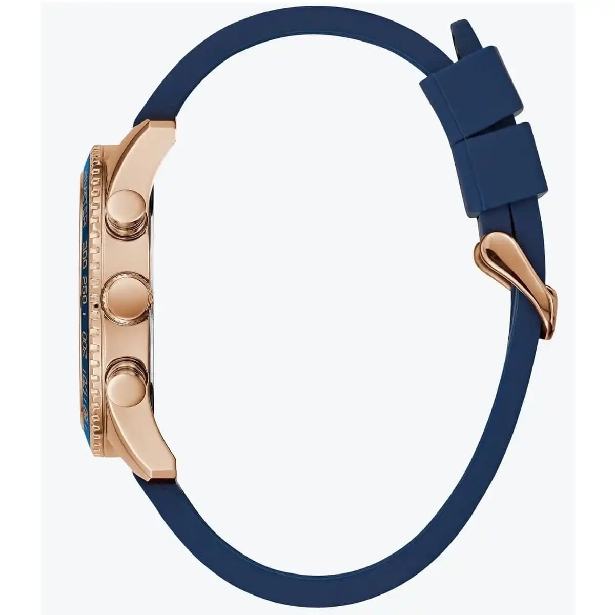 Le modèle Guess W0971G3  de la collection Fleet et est une montre pour homme au design sportif et moderne, caractérisée par un bracelet en silicone bleu et un boîtier en acier inoxydable (souvent de couleur or rose).