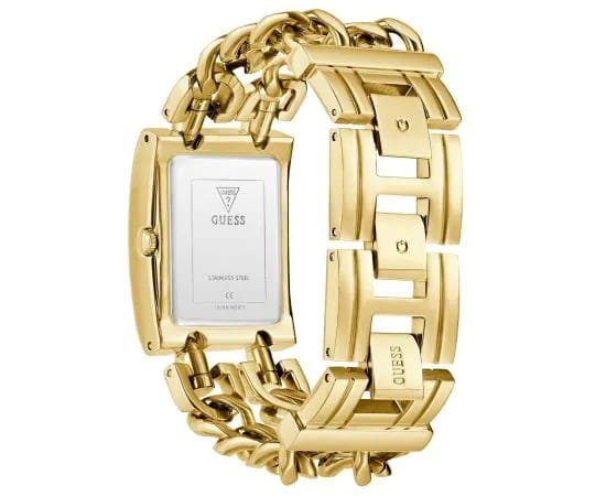 La montre Guess Mod Heavy Metal GW0740L2, un modèle pour femme doté d’un bracelet et d’un boîtier de couleur dorée, et d’un cadran rectangulaire vert.