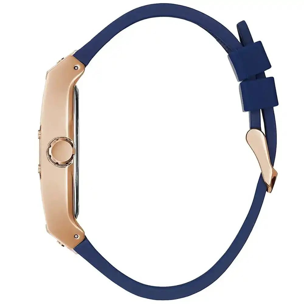 Découvrez la montre Guess Phoenix GW0386G2. Avec son boîtier en acier inoxydable doré rose et son bracelet en silicone bleu et brun, elle allie élégance et confort. Résistante à l’eau jusqu’à 50 mètres, elle dispose d’un cadran bleu serti de diamants. Dimensions : 44 mm de large et 10 mm de haut.