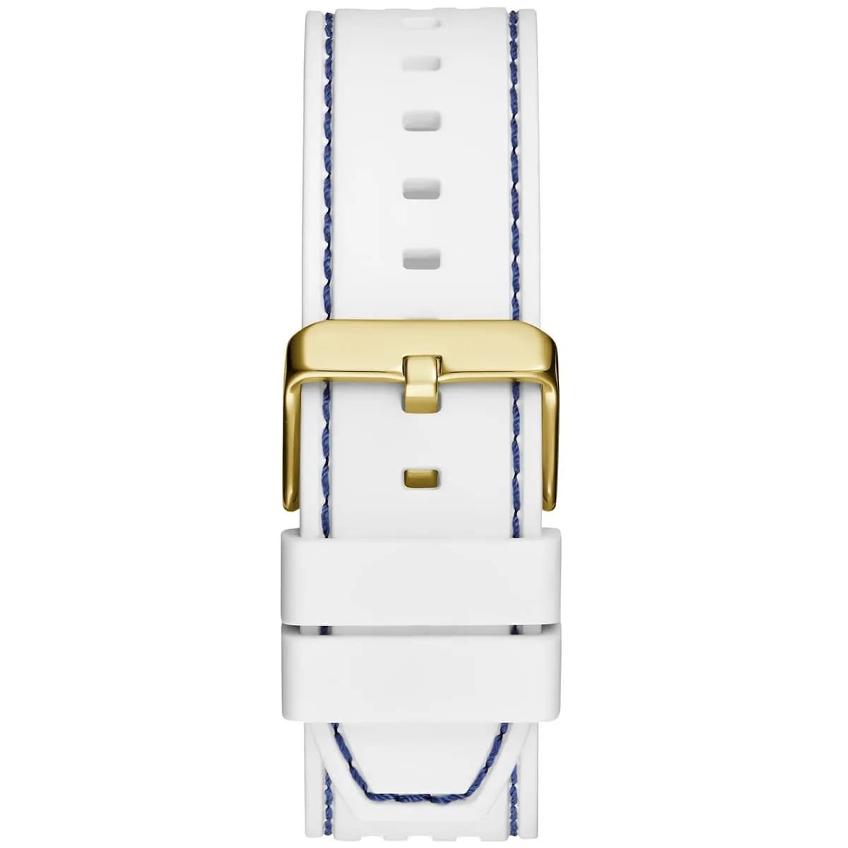 La Guess Phoenix GWO499G6. C’est un modèle multifonction pour homme, caractérisé par son boftier bleu transparent et son bracelet blanc en silicone.