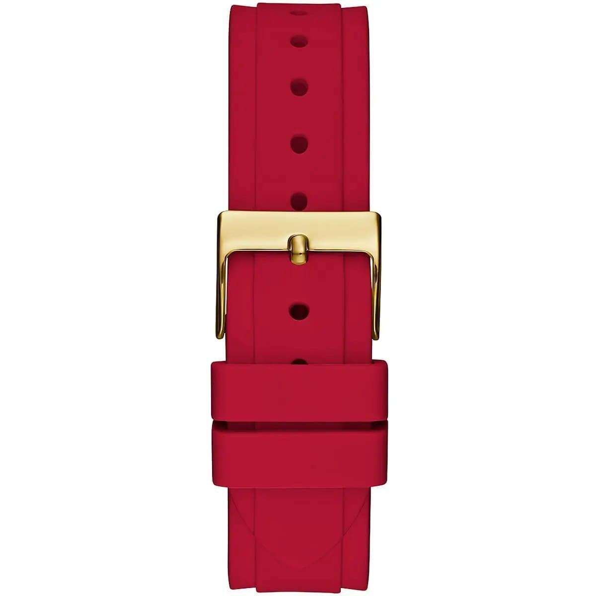 La montre Guess Solstice GW0484L1 Cette montre allie un design sportif et élégant, avec un bracelet rouge vif et un boîtier doré glamour orné de détails en cristal, en faisant un accessoire chic pour diverses occasions.