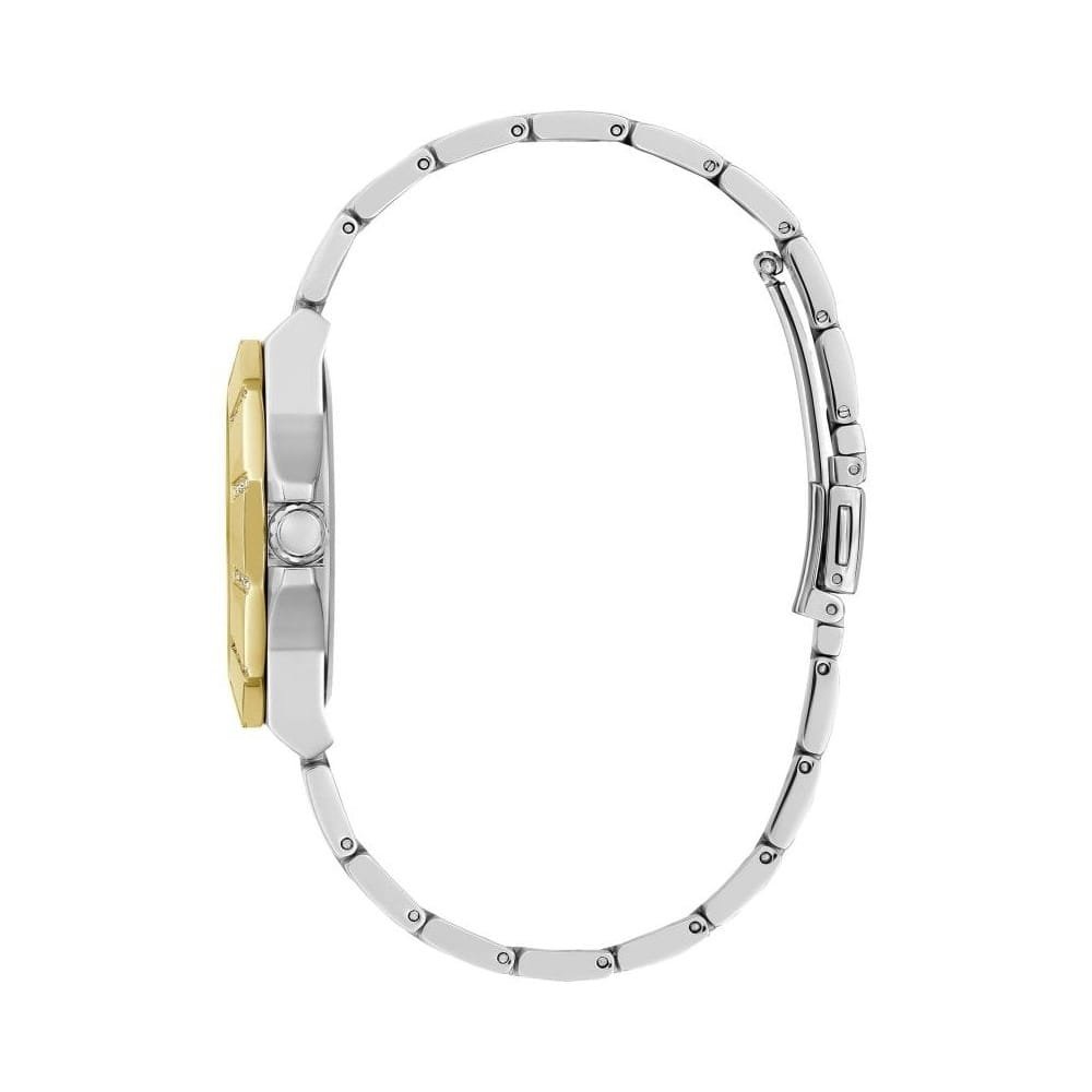 La montre Guess Sunray GWO616L2. Elle combine des éléments argentés et dorés et possède un cadran orné de cristaux.