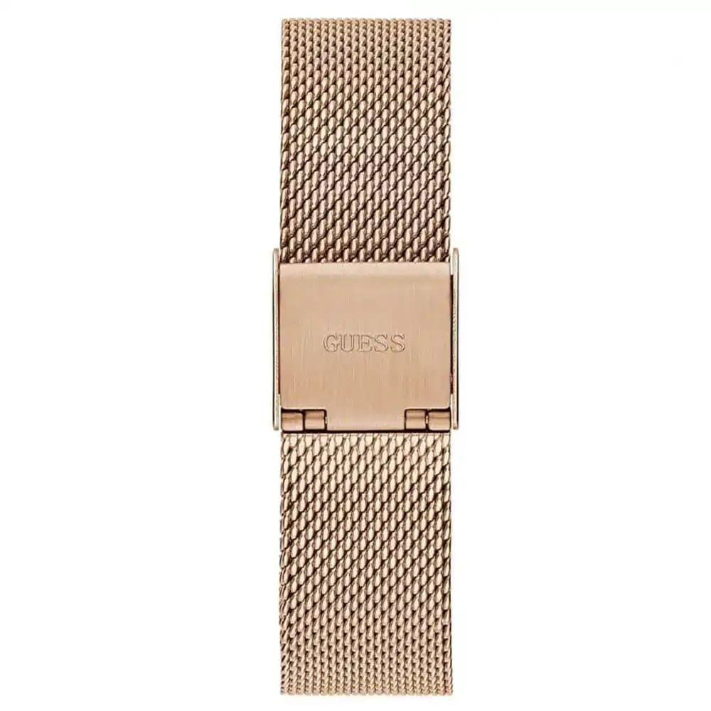 La Guess Tapestry GW0354L6 avec un boîtier et un bracelet en maille milanaise en acier inoxydable doré, et des cristaux sur la lunette.