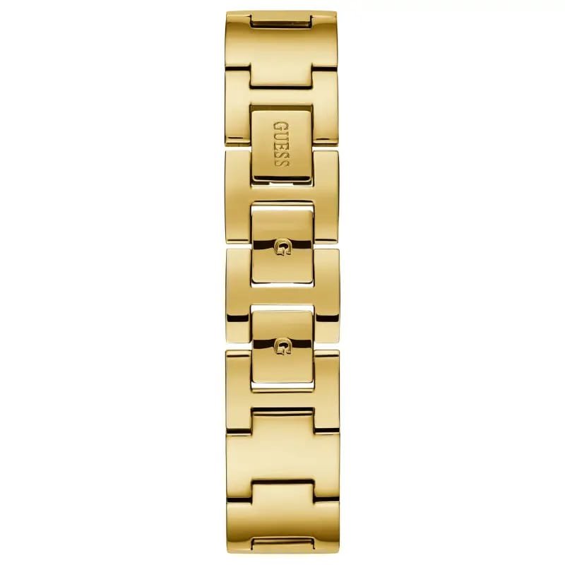 la Montre Guess Tri Glitz W1142L2. C’est un modèle pour femme, entièrement doré, doté d’un bracelet en maille milanaise et d’un cadran pailleté orné de cristaux.