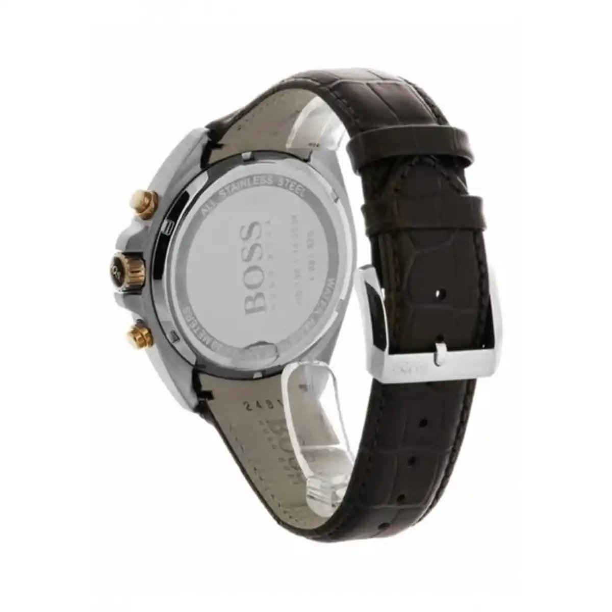 La montre chronographe Hugo Boss Driver HB1512881, avec un boîtier en acier inoxydable argenté, un cadran argenté et des sous-cadrans et aiguilles couleur or rose sur un bracelet en cuir marron.