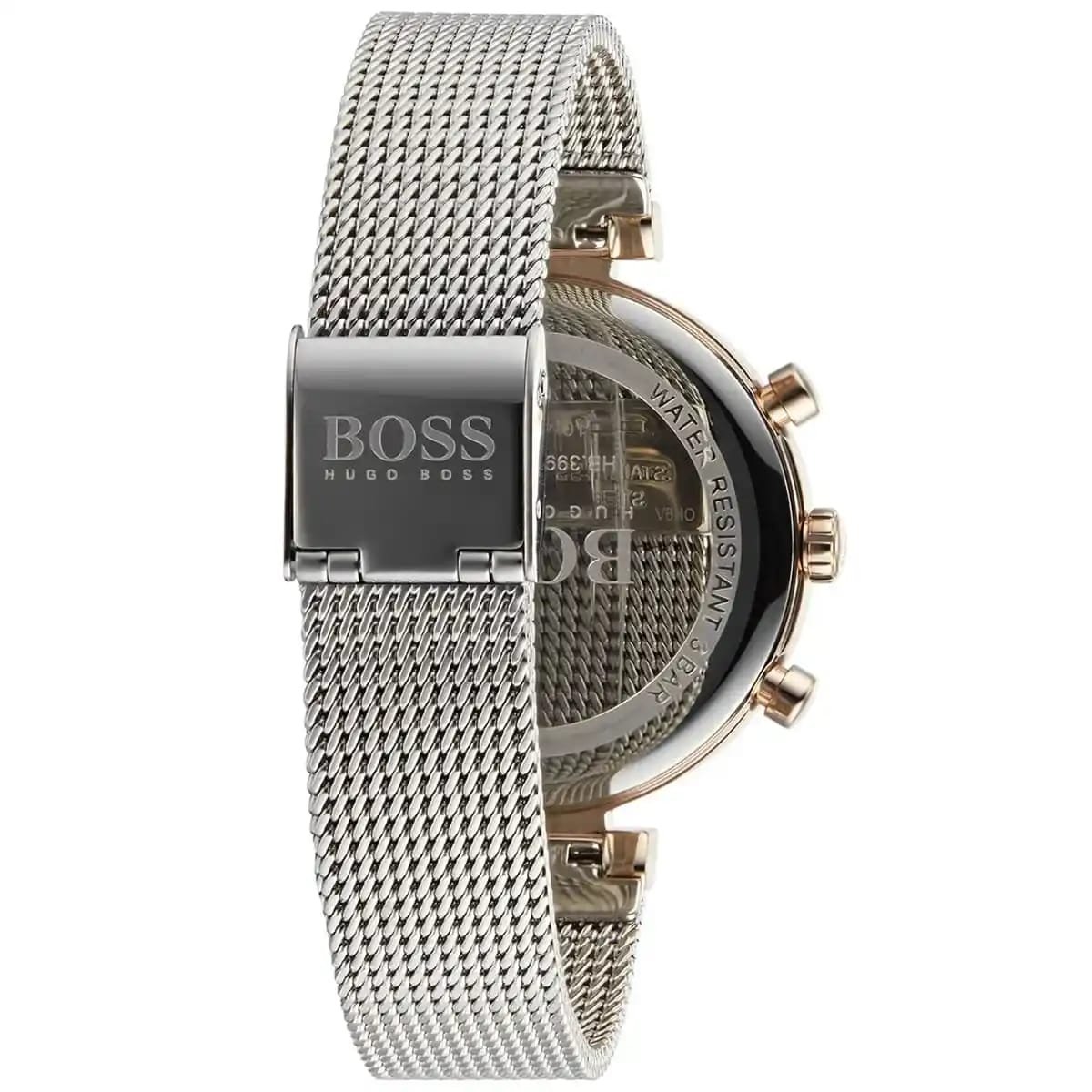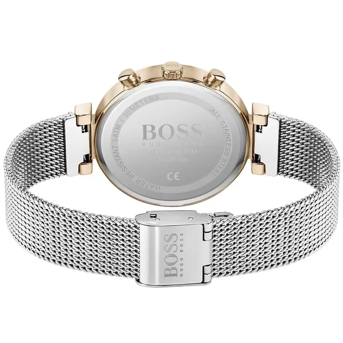 Le modèle HB1502551 est une montre pour femme élégante issue de la collection Flawless de Hugo Boss, caractérisée par un design bicolore argenté et doré rose.
