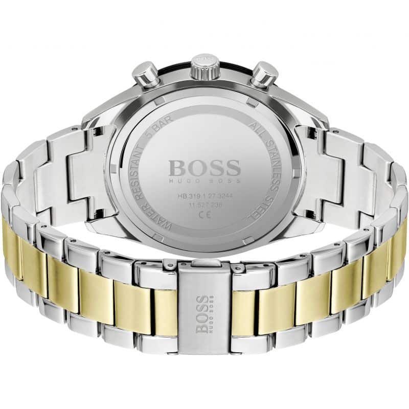 La montre chronographe Hugo Boss Santiago HB1513872 avec un cadran vert et un bracelet bicolore acier inoxydable argenté et doré.