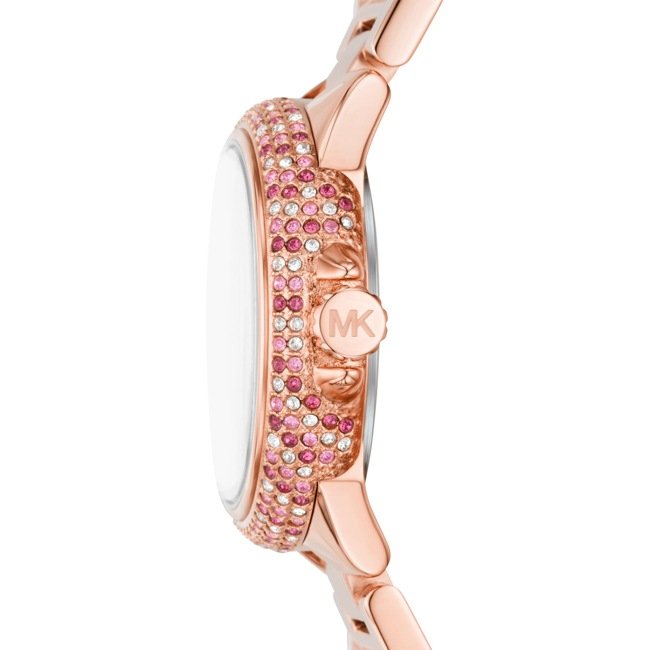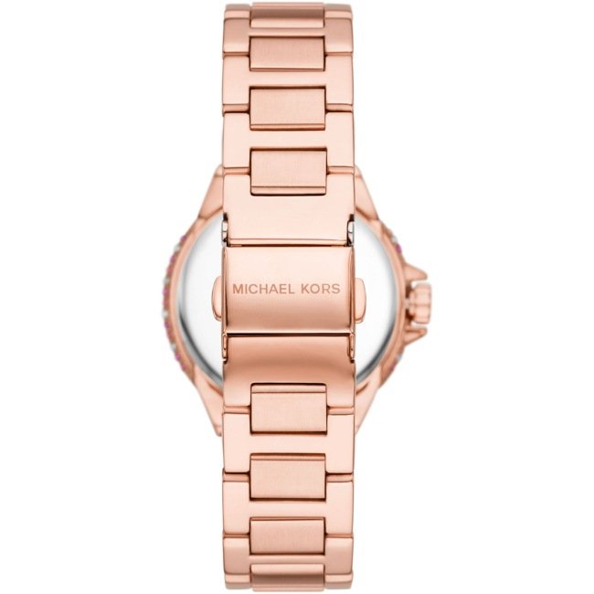 La montre Michael Kors Camille MK7273 en acier inoxydable ton or rose. Elle présente une lunette et un cadran rose sertis de cristaux pour un look glamour.