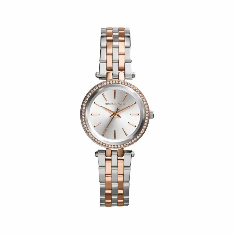 La Michael Kors Drci Mini MK3298 allie élégance et raffinement : boîtier bicolore argent et or rose, lunette pavée de cristaux et cadran délicat, pour un style féminin et sophistiqué à chaque instant.