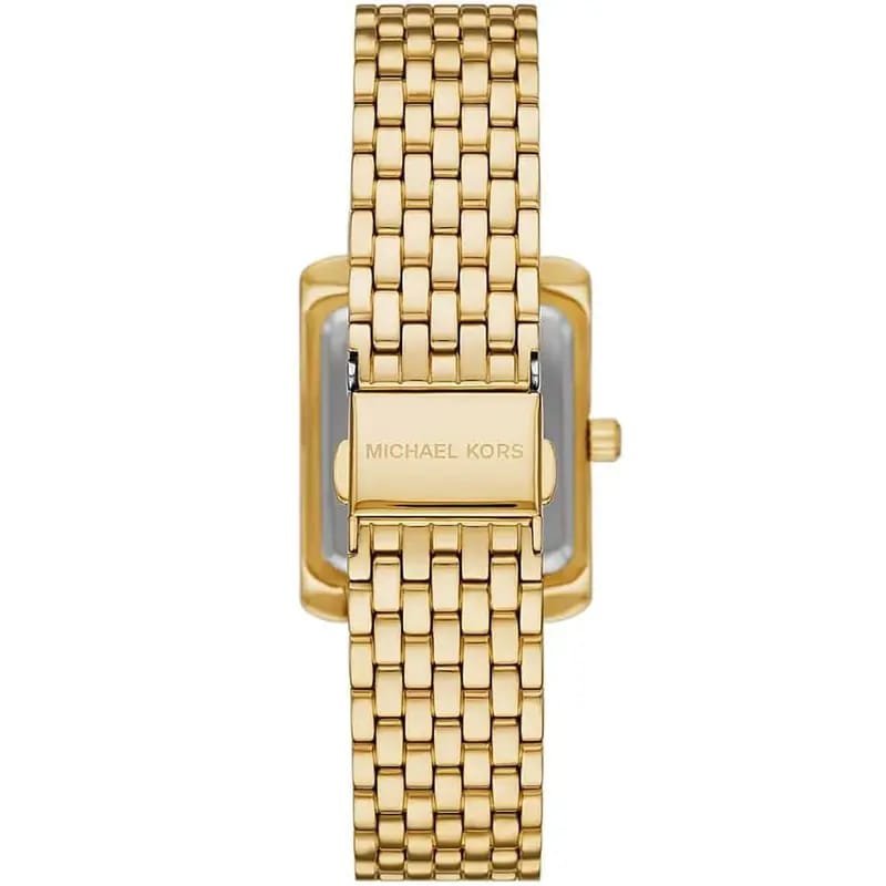 La montre Michael Kors Emery MK4742 , un modèle à quartz avec un boftier et un bracelet en acier inoxydable doré, et un cadran rectangulaire vert émeraude.