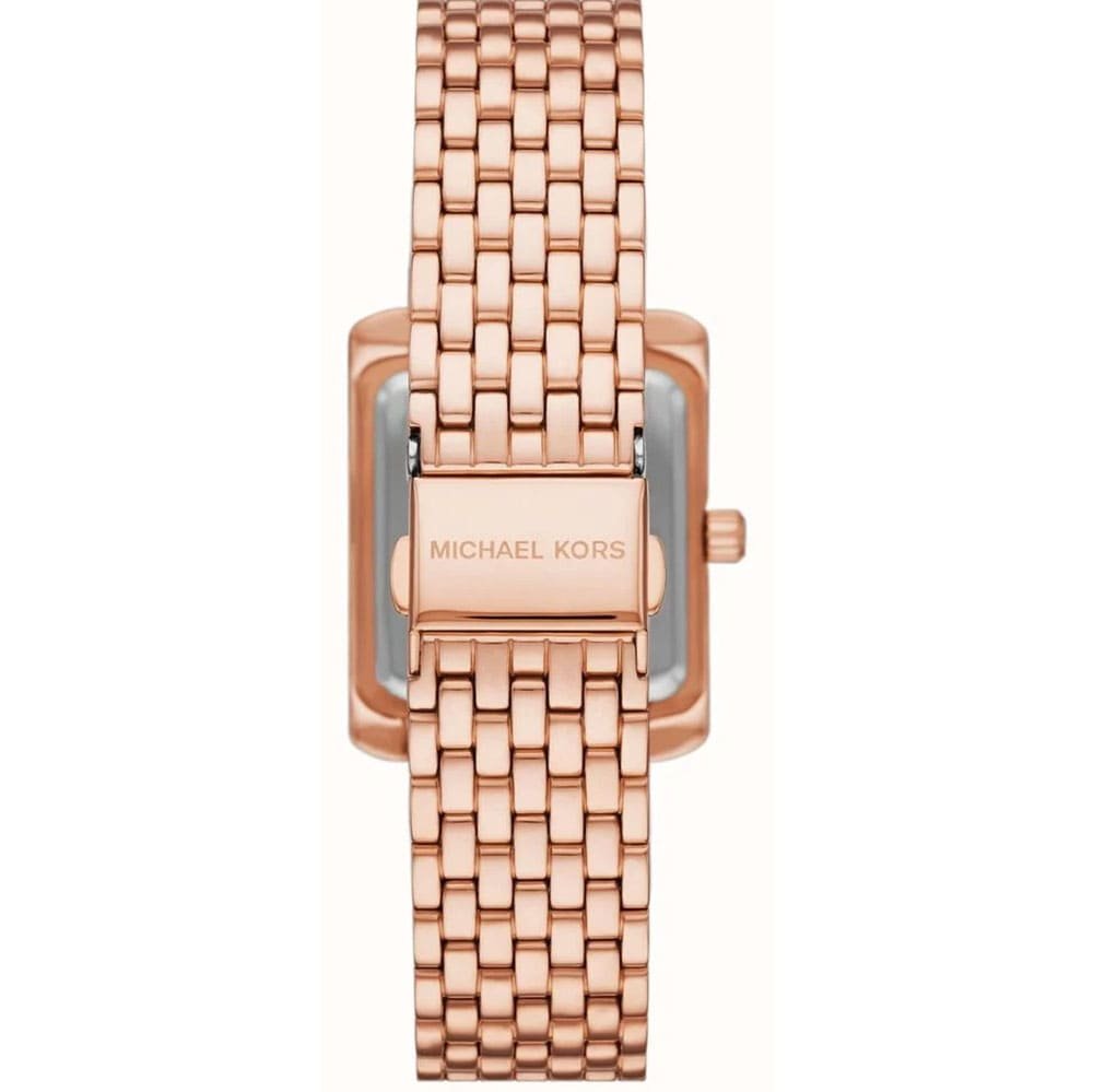 La montre Michael Kors Emery MK4743, dotée d’un boîtier et d’un bracelet rectangulaires en acier inoxydable doré rose.