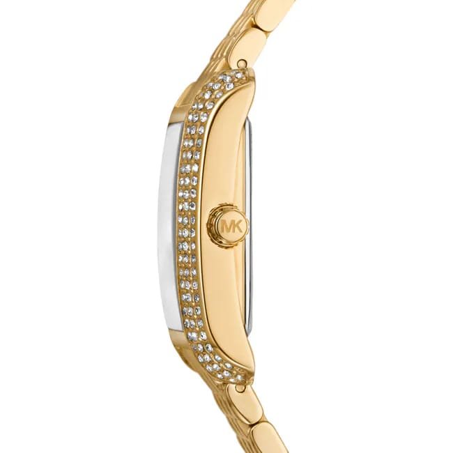 La montre Michael Kors Emery MK4826, un modèle féminin à quartz avec un boîtier et un bracelet en acier inoxydable doré et un cadran blanc orné de cristaux.