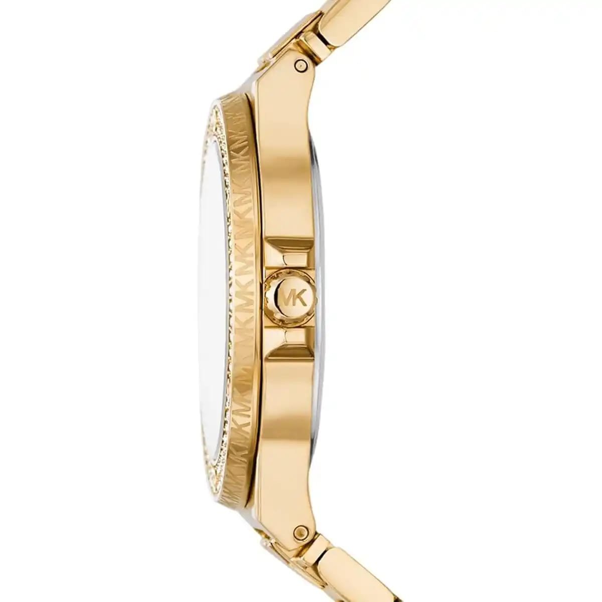 Détails : La lunette fixe est ornée de cristaux, et le bracelet présente des détails avec le logo MK