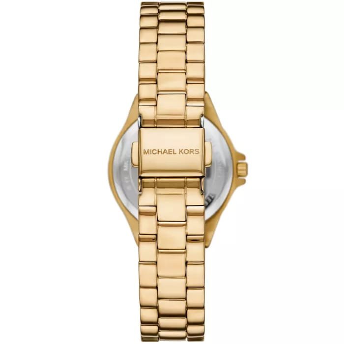 La montre Michael Kors Lennox MK7395, un modèle féminin doté d’un boîtier et d’un bracelet en acier inoxydable doré et d’un cadran vert orné de cristaux.