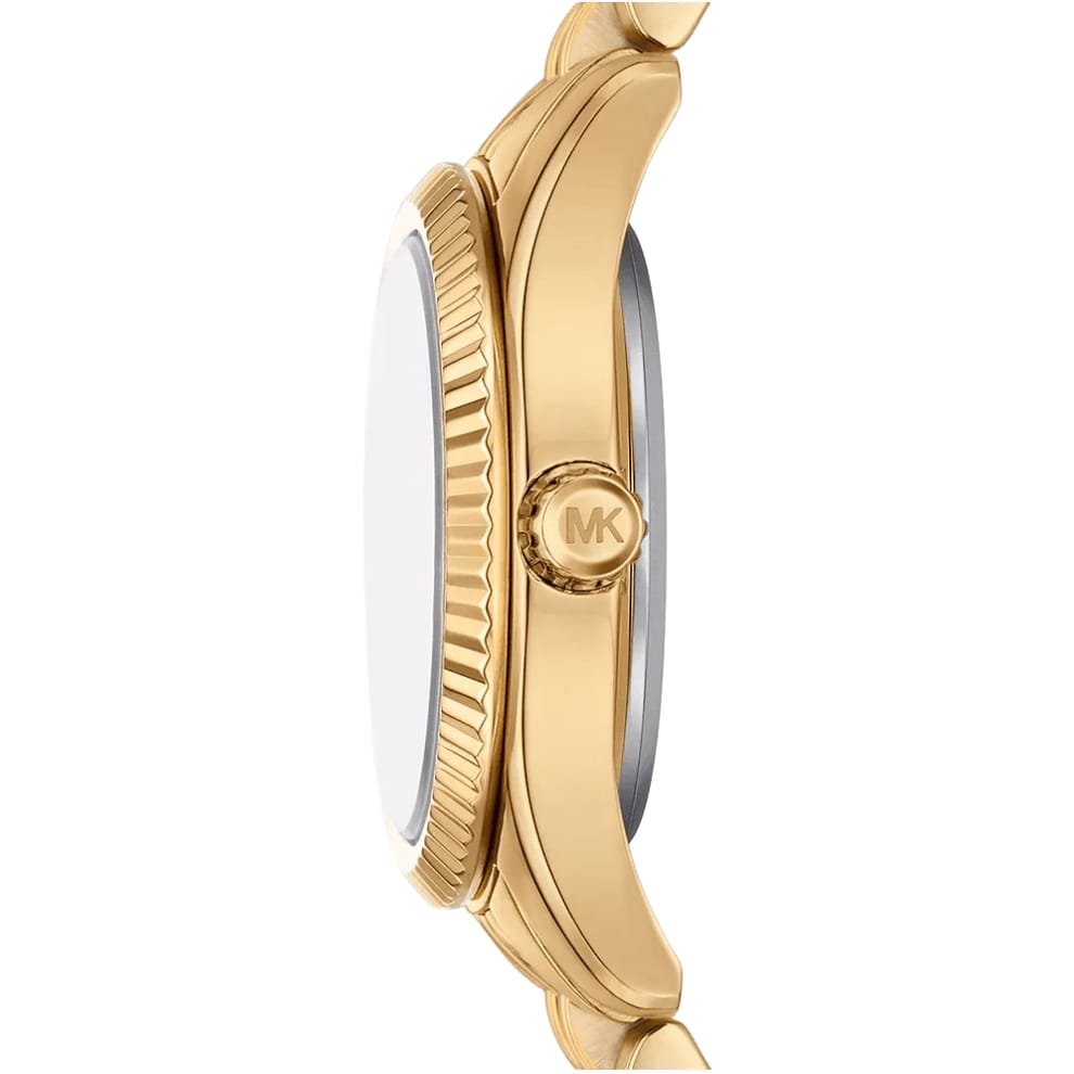La Michael Kors Lexington MK4802. Elle est dotée d’un boftier et d’un bracelet en acier inoxydable de couleur or, et d’un cadran bleu foncé scintillant orné de cristaux.