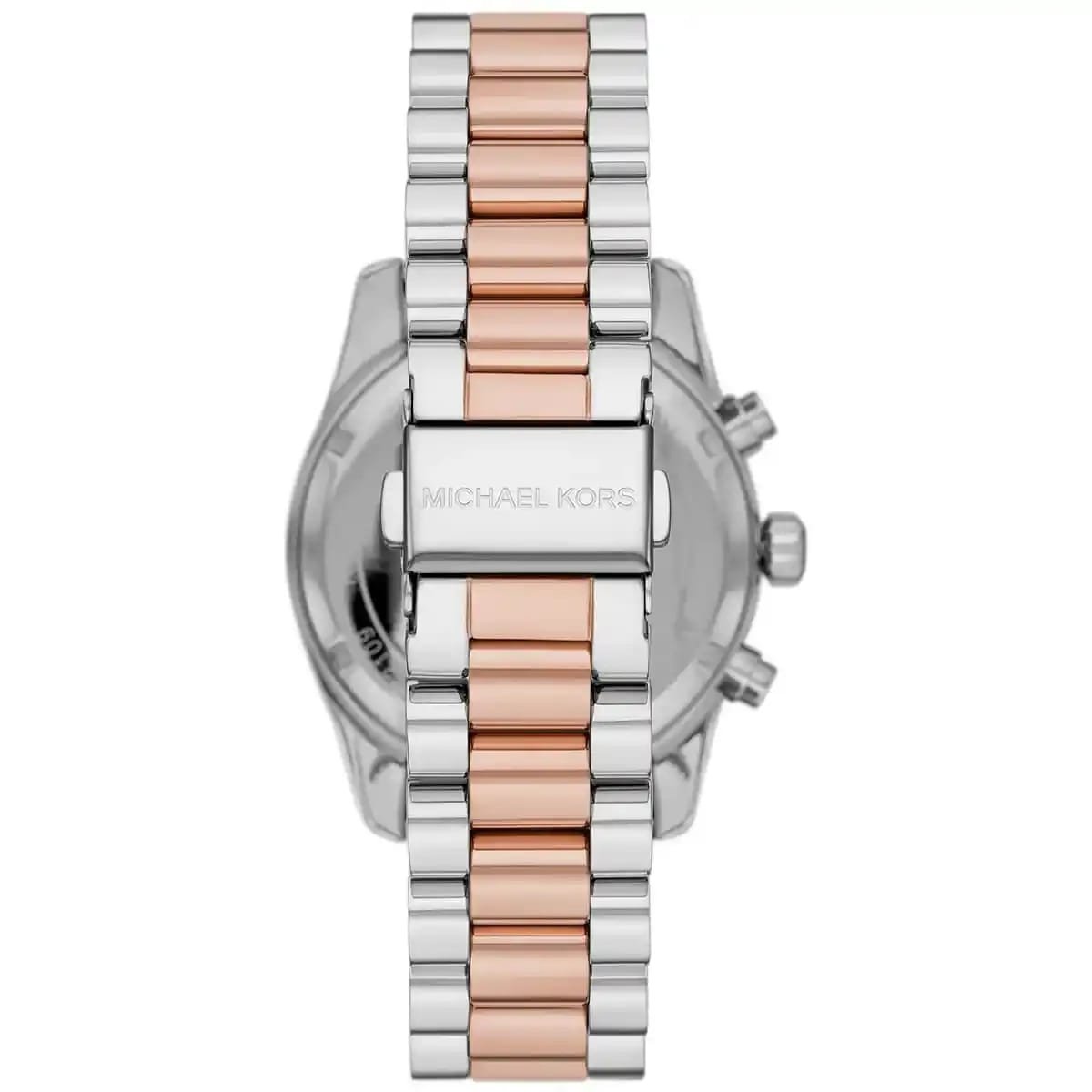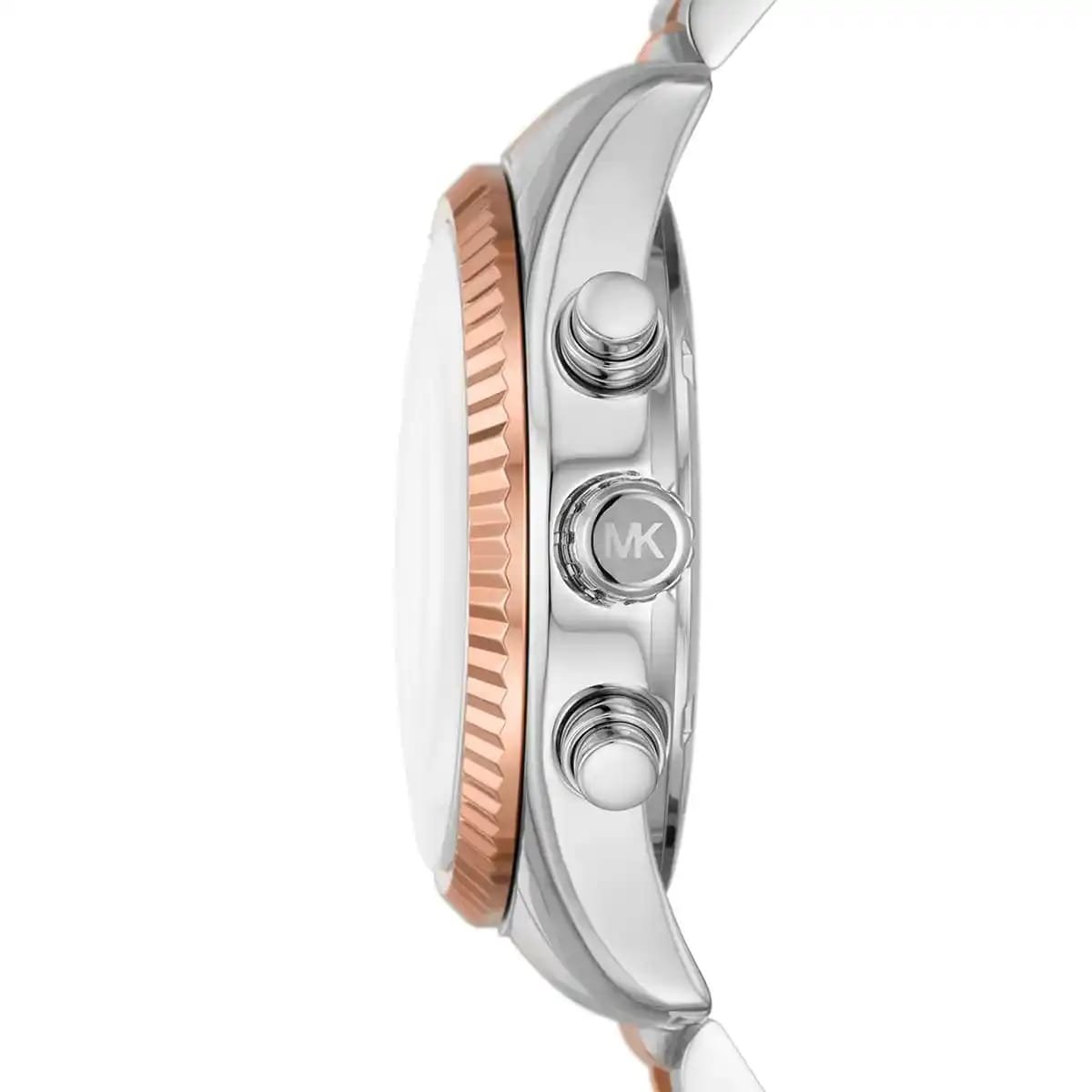 la montre chronographe Michael Kors Lexington MK7219, dotée d’un boîtier et d’un bracelet bicolores (argent et or rose) et d’un cadran rose.
