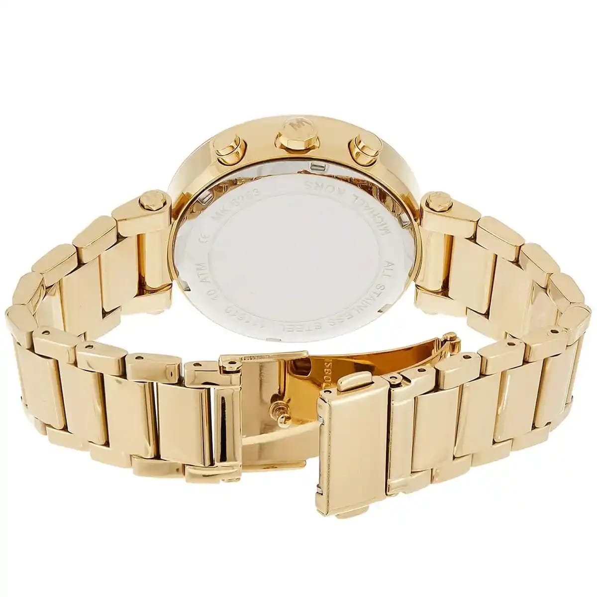 La montre Michael Kors Parker MK6263 Chronograph avec un boîtier et un bracelet en acier inoxydable doré et un cadran vert. C’est un modèle élégant et fonctionnel, reconnu pour son style sophistiqué.