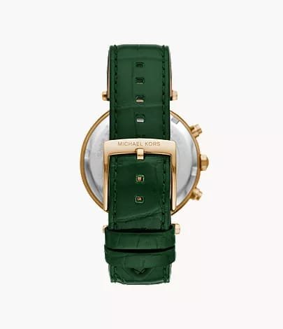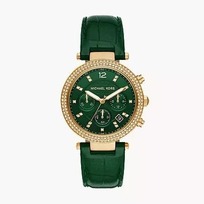 La Michael Kors Parker MK6985 est une montre chronographe pour femme de la collection Parker, reconnue pour son style chic et glamour. Elle se distingue par son boîtier doré et son cadran vert vif, complétés par une lunette ornée de cristaux scintillants.
