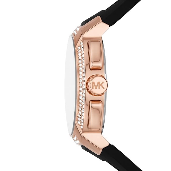 La montre Michael Kors Oversized Sidney MK7245 Pavé à cadran noir et bracelet en silicone noir pour femme, numéro de modèle MK7245. Cette montre de luxe sport est dotée d’un boîtier et d’une lunette de couleur or rose (rose gold-tone) ornée de cristaux, et d’un bracelet en silicone texturé noir.