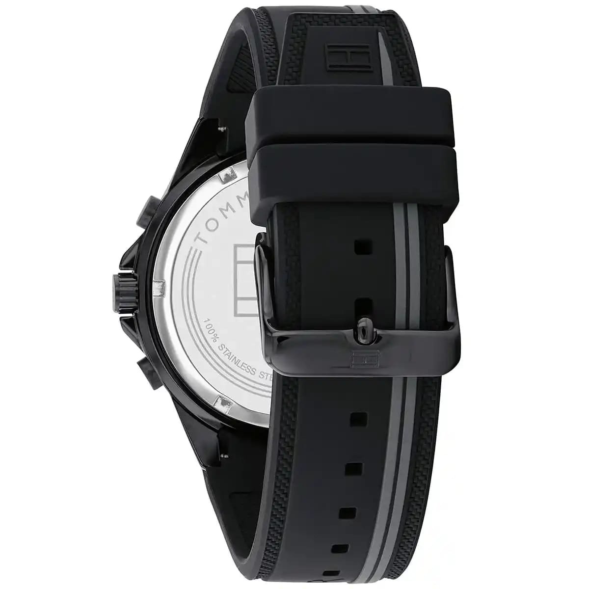 La montre Tommy Hilfiger Aiden 1791861 est une montre pour homme de style sportif dotée d’un mouvement à quartz multifonction et d’un bracelet en silicone noir.